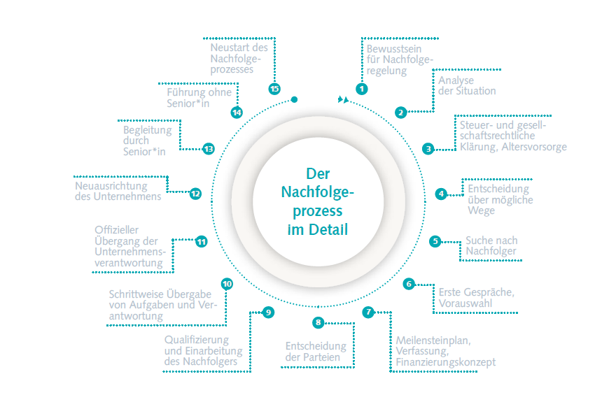 Je eher sich die Betroffenen diesem Thema stellen, strukturiert vorgehen und von vornherein drohenden Gefahren begegnen, desto mehr Zeit, Geld und Ärger bleiben erspart. Unternehmensnachfolge betrifft viele, unter anderem Familie, Freunde, Nachfolger, Lebenspartner, Mitarbeitende, Kollegen, Geschäftspartner, Kunden. Aber das Heft des Handelns liegt zu Beginn bei der übergebenden Generation, der Senior-Chefin oder dem Senior-Chef. Sie haben zunächst zu entscheiden, wann und wie die nächste Lebensphase starten soll und wie das berufliche Erbe weitergetragen wird. Sie sind der erste und wichtige Akteur in diesem Wandelprozess.