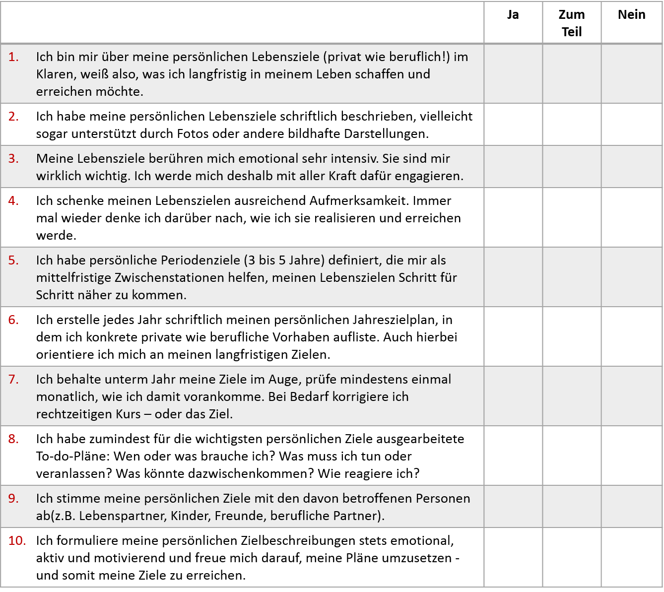 Wichtige Grundlagen der persönlichen Zielklarheit sind insbesondere die langfristige Ausrichtung, die emotionale Verbundenheit und ein systematisches Vorgehen. Prüfen Sie doch mal, inwieweit diese Grundlagen bei Ihnen gegeben sind beziehungsweise bei welchen Punkten Sie Handlungsbedarf erkennen.